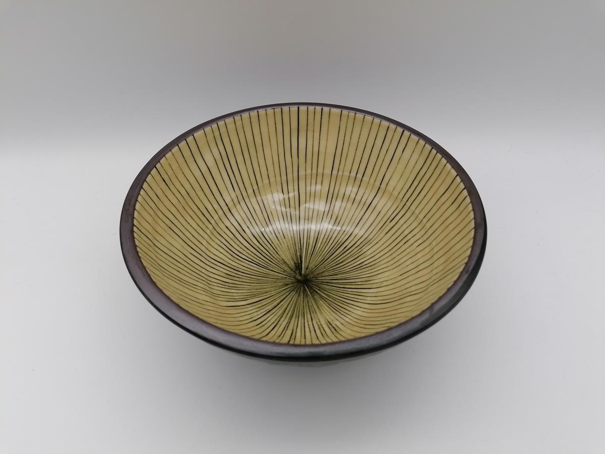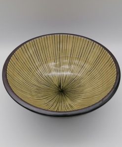 Bellissima ciotola artigianale da domburi (piatto tradizionale a base di riso guarnito con diversi topping), in ceramica giapponese di colore verde scuro a spirali, con interno color crema e sottili righe nere.