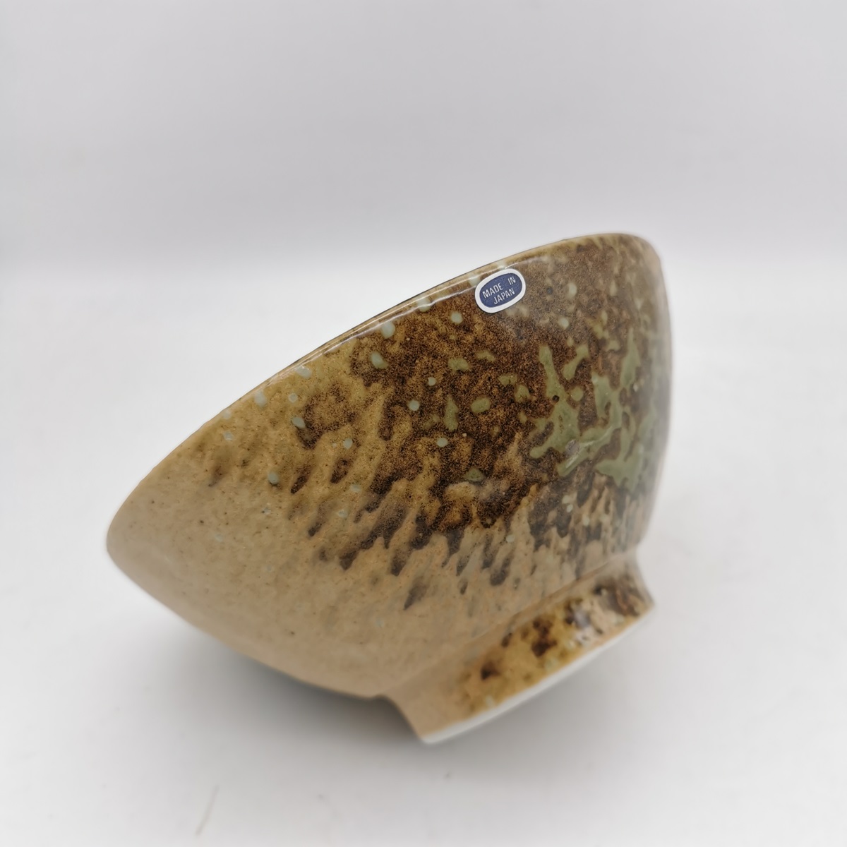 Ciotola da domburi (piatto tradizionale a base di riso guarnito con diversi topping), in ceramica giapponese color ocra, con bellissima decorazione ad effetto wabi-sabi (naturale, grezzo) sui toni del marrone e del verde.
